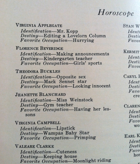 I loved the page that predicted the futures of Burbank High School seniors. Theadora Buckles was to be a Mack Sennet star. Virginia Campbell was to be a WAMPAS Baby star. Sandwiched between the two was my aunt Jan (formally called Jeanette) — voted most likely to become a gym teacher.