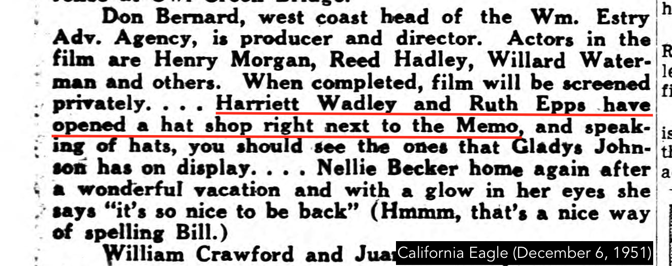 According to both the California Eagle and Los Angeles Sentinel, Wadley’s hat shop was in the same building at the Memo Night Club at 4262-4264 S. Central Avenue (some articles refer to it as Memo Building).
