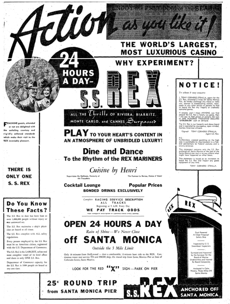Warren’s adversary in this battle was the Rex owner and operator, Anthony Cornero Stralla (known as Tony Cornero). Cornero had been a key Los Angeles rum-runner during prohibition, smuggling bootleg alcohol on boats from Mexico and Canada. When authorities caught him returning from Mexico with a thousand cases of rum, he joked that he’d purchased the illegal cargo “to keep 120 million people from being poisoned to death.”