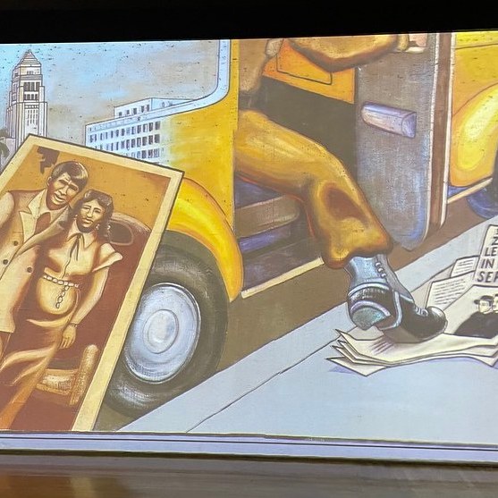 As a long-time fan girl of artist Judy Baca, I relished the opportunity to sit so closely with the artist’s work on display at the Museum of Latin American Art’s exhibit. Her mural in the Tujunga Wash, “The Great Wall of Los Angeles,” is absolutely amazing but one can only admire it from a distance (and in the book “BACA: Art, Collaboration & Mural-Making“). While most folks found inspiration in the immersive Vincent Van Gogh exhibit in Hollywood, I found it while being surrounded by MOLAA’s “Great Wall of Los Angeles” display in Long Beach.