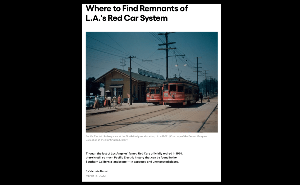 Having heard so many Red Car stories in my family, I was honored to write a KCET article about where to find remnants of those trolleys in Southern California. Considering that the last Red Car retired in 1961, it’s impressive that so much of that infrastructure — and traces of that infrastructure — can still be found throughout Southern California. I wonder, is that true for other cities who abandoned their old transit systems?
