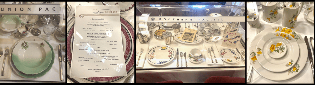 Inside the museum’s Santa Fe Railroad dining car, the Cochiti, is an impressive display of the different china patterns used for different railroads. According to this exhibit, the fine china was heavyweight and institutional-grade in order to withstand the rigors of train service. This beautiful California Poppy design used by the Santa Fe Railway and Fred Harvey Houses has been reproduced for the museum and is available in its gift store. Sure wish Amtrak offered such service on its current lines.