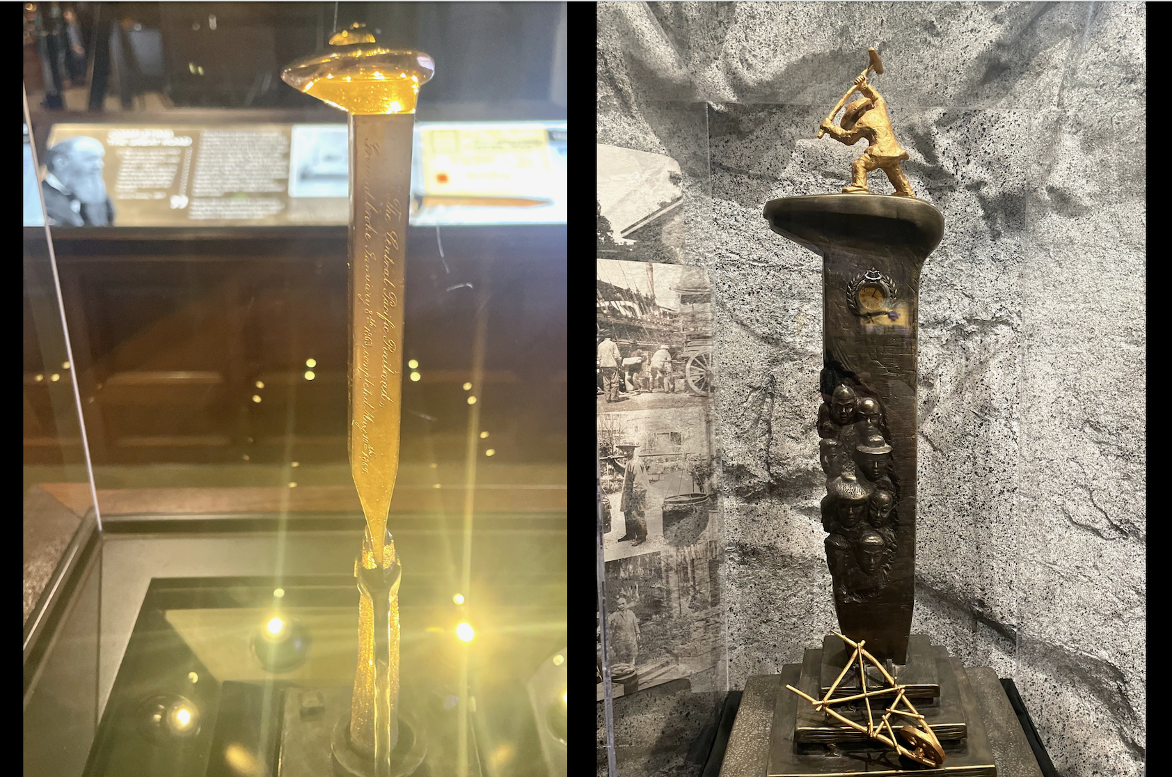 My mom and I had a number of conversations about ceremonial gold spikes — the one at Lang Station and the one in Promontory, Utah. If unfamiliar, these golden spikes were ceremoniously used to signify the last spike of a new railroad. The golden spike at Lang Station celebrated the the railroad’s connection between Northern and Southern California and was in the archives of the California Historical Society (now Stanford University?). The one from the May 10, 1869 ceremony is displayed here, at the California State Railroad Museum. Also, loved artist Limin Zhou’s “Silent Spike” (2016) that he dedicated to the Chinese workers of the Transcontinental Railroad.