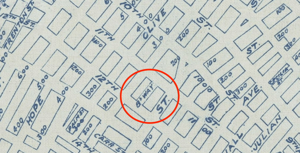 When Hearst purchased this parcel on Hill and 11th Street, Broadway did not intersect with 11th Street because it turned into Main Street. When announced in 1913, the plans for the Examiner Building included a frontage on Broadway that did not exist at the time. My sense is that Hearst and his team built the street and then gave the right of way to the City of Los Angeles, but I have yet to confirm that with documentation. Several years would pass before Broadway extended seamlessly to Pico (see KCET article on the history of Broadway Place). Map (1917) courtesy of the Los Angeles Public Library.