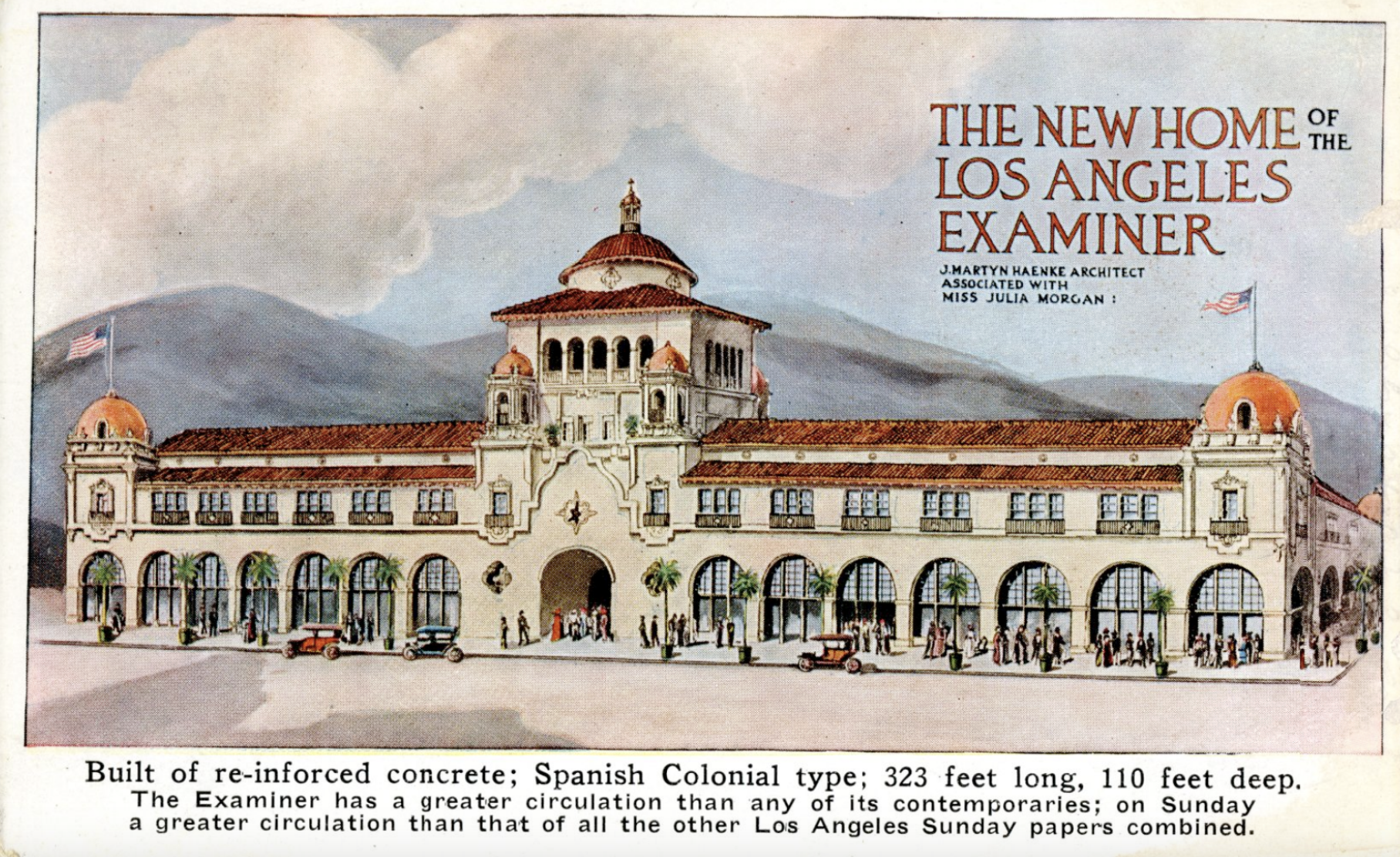 For almost 50 years, this building was known as the Los Angeles Examiner Building. It became the Herald Examiner Building in 1962, when the Examiner merged with the Los Angeles Herald-Express, also owned by the Hearst Corporation. Also, the names of architects J. Martyn Haenke and W.J. Dodd appear on some documents related to this building but, according to the Historic Resources Group, Hearst always referred to Julia Morgan as the architect. It’s suggested that she may have worked with them to fulfill local building requirements. Postcard comes from SDSU’s University Library’s digital collections.