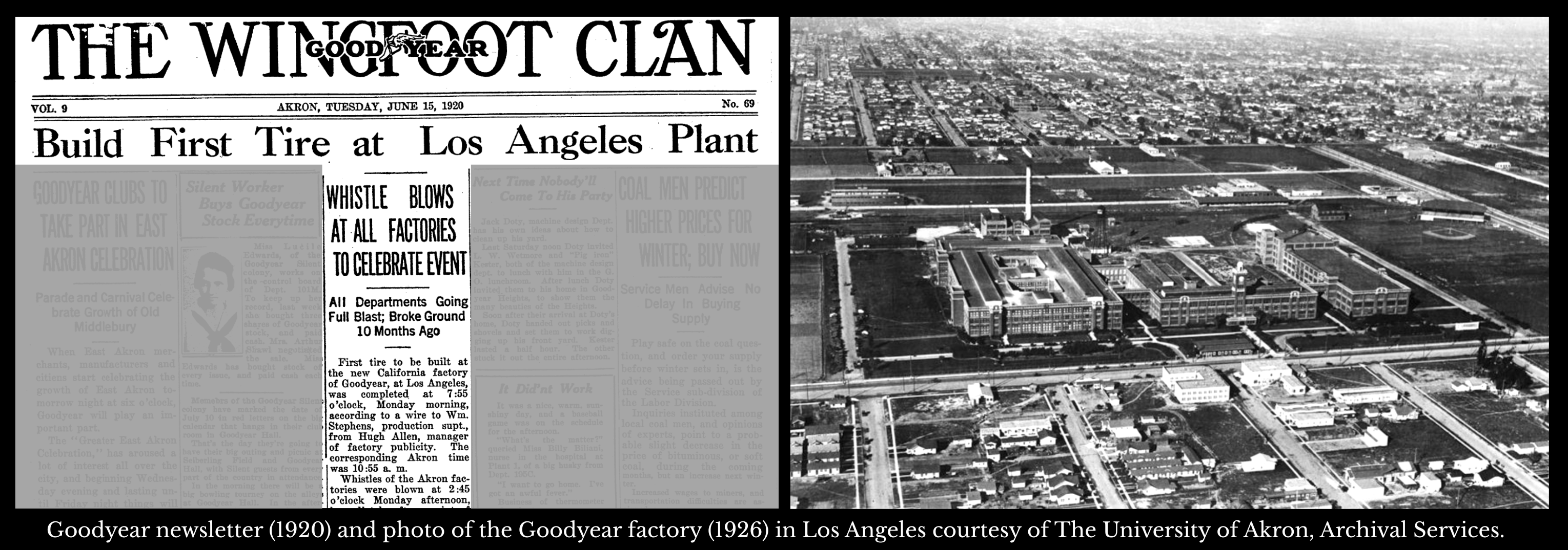 These baby blimp flights over Los Angeles coincided with the opening of the Goodyear Tire and Rubber Company on South Central Avenue in June 1920. Goodyear was the first company to build a large tire and rubber factory on the West Coast (and in Los Angeles). By the late 1920s, B. F. Goodrich Tire Factory (1928), Firestone Tire and Rubber Plant (1928), Samson Tire & Rubber Company (1929) followed suit. With these four tire factories, Los Angeles became the second largest rubber manufacturing center in the US.