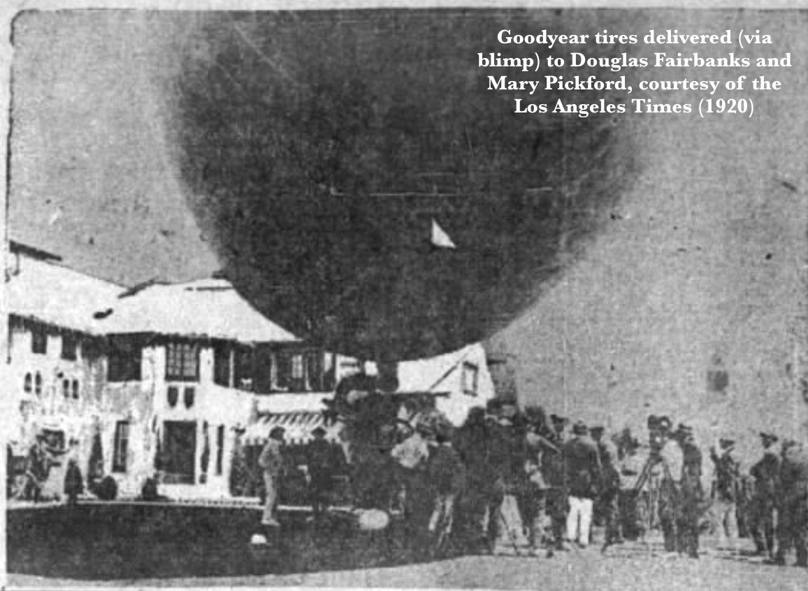 I have to admire Goodyear’s publicity team who crafted this impressive PR stunt — delivering the factory’s first tires to Hollywood’s biggest star via a midget dirigible that landed in a Beverly Hills front yard definitely made headlines. Plus, the blimp probably caught the attention of every Angeleno in its path that morning (planes and airships were not crowding the skies back in 1920).