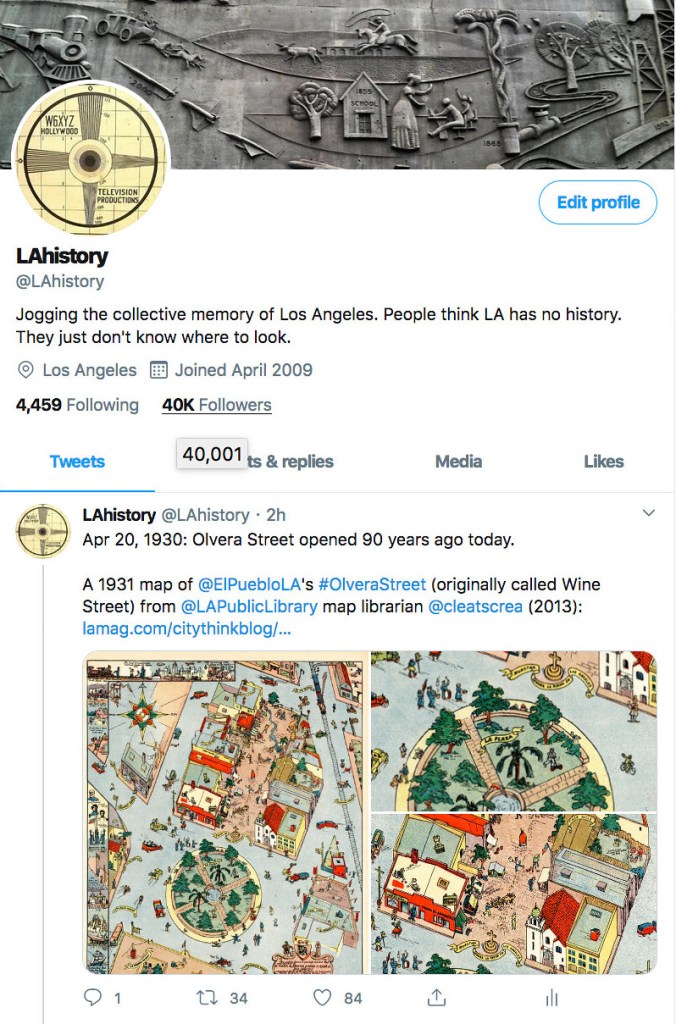 I started the @LAhistory Twitter project with my mom in 2009 as a way to draw attention to all the amazing work of the LA history community, broadly defined. From 1960s – 1980s, my mom wrote about Southern California for Sunset Magazine and then worked at the Huntington Library for the next 25 years. We have a 130-years of family history in the region so this mother-daughter project was both a personal and professional endeavor. In 2009, there was not much Los Angeles history posted to social media. Now there’s so much, it’s hard to keep up.